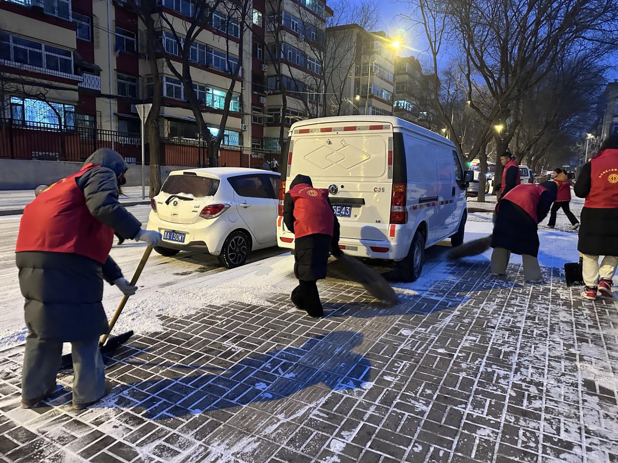 抵达玉河社区后,志愿者们迅速与社区工作人员和网格员对接,详细摸排社区内积雪结冰的重点区域。经过简短高效的分工部署,志愿者们聚焦社区主干道、单元楼门口、便民通道和休闲广场等居民日常出行高频路段,一场清雪攻坚战正式打响。志愿者们的身影在晨光中不断移动穿梭、在寒风中鲜亮的红马甲与洁白的积雪相映成景,志愿者们的脚步声、工具与地面的碰撞声,交织成一曲温暖动人的清晨奉献之歌,传递着新时代青年的责任与温度。