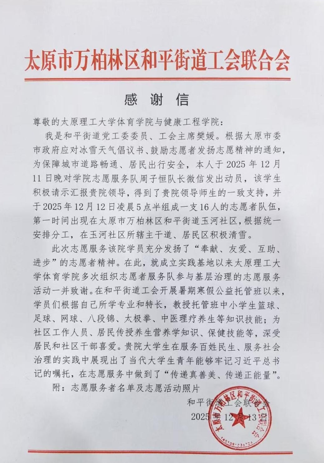 为表达对志愿者们的诚挚感谢,玉河社区特意发来感谢信。信中高度赞扬了同学们在极寒天气下“不畏严寒、冲锋在前,以最快速度集结到位,用汗水为社区居民筑起冬日‘安全屏障’”的辛勤付出,盛赞大家充分体现了当代大学生的良好精神风貌和强烈社会责任感。伟德BV1946多次组织志愿者深度参与基层治理志愿服务活动,充分发挥一站式社区建设功能,在志愿服务中做到了“传递真善美、传递正能量”。