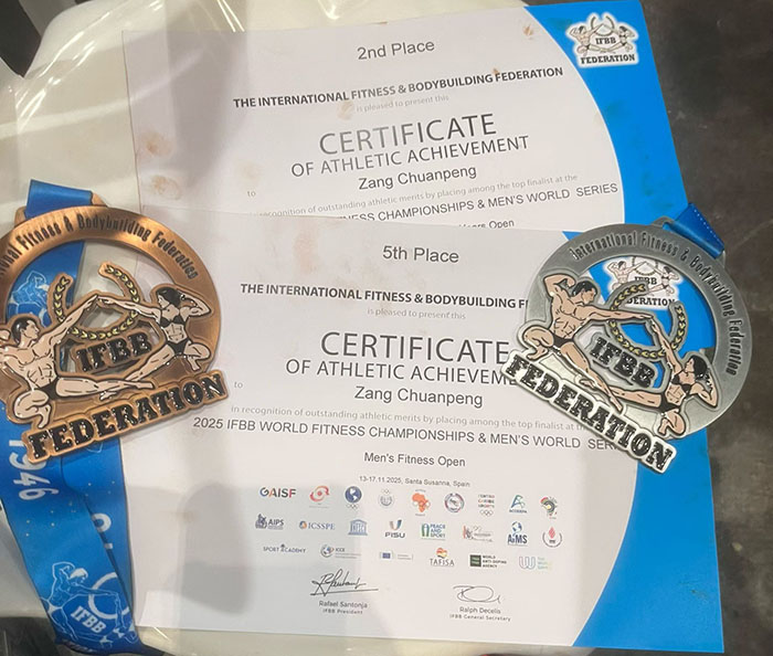 在竞争激烈的男子健身项目中,臧传鹏面对各国强手从容应战。青年组比赛中,他动作标准利落、肌肉线条流畅,每一个造型都精准展现力量与美感的完美融合,最终以出色表现斩获亚军;公开组赛场高手云集,他顶住压力奋勇争先,凭借扎实的训练功底和极具感染力的赛场表现力,拿下公开组第五名的优异成绩。