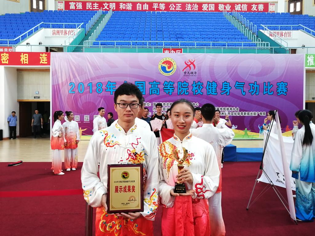 大会还安排了包括拉丁舞、健身气功表演、太极功夫扇表演等交流活动。在赛场上,我院运动员斗志昂扬、不畏强手,经过四天的角逐,在集体项目比赛中,荣获五禽戏和竞技六字诀两项二等奖,在个人单项分别荣获第四名和第五名。另我校在此次比赛中还同时被评获全国高等院校健身气功展示成果奖和最佳推广奖,这说明我校在弘扬中华优秀传统文化方面得到国家体育总局的肯定。