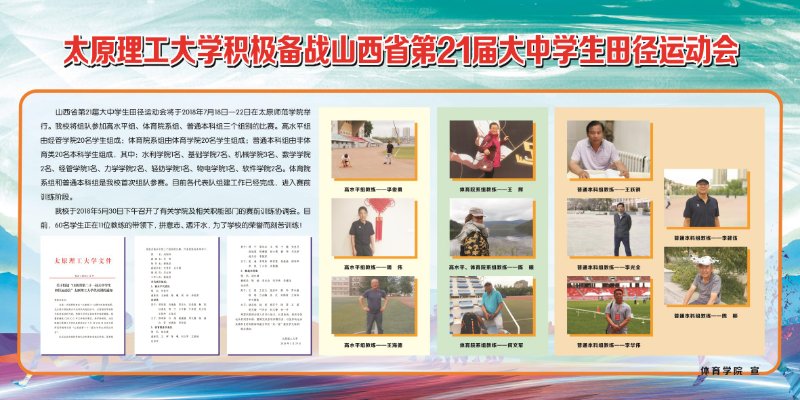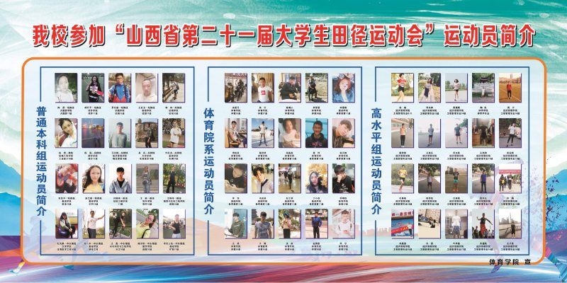 本次运动会我校将组队分别参加普通本科组、体育院系组及高水平组三个组别的比赛;目前,各代表队正积极备战山西省第21届大中学生田径运动会。