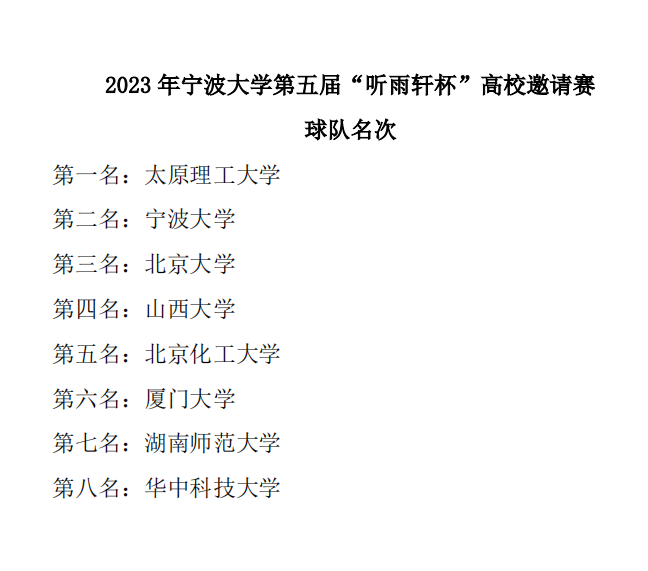 2023年11月3日-11月8日,应宁波大学邀请,我校男子篮球队赴浙江省宁波大学参加2023年“听雨轩”杯高校篮球邀请赛,对战北京大学、厦门大学、宁波大学等国内知名高校获得本届比赛总冠军!