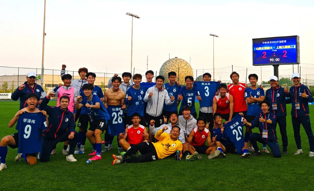 在第二场对阵上海三菱重工足球队比赛中,我校球员秉着永不放弃、太理必胜的决心,不畏强手,在上半场0:1落后的情况下,下半场打出勇猛顽强、敢打敢拼的攻势足球,2:2战平。随后进行点球大战,38号守门员王芝松高接低挡,表现神勇,最终以3:2战胜对手,以大区赛第二名成绩晋级2024赛季中冠联赛总决赛!