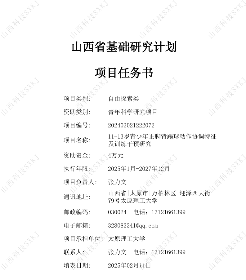 山西省基础研究计划旨在支持基础科学研究,鼓励科研人员进行自由探索,推动科学创新。该项目以正脚背踢球动作为例,进一步明确11-13岁青少年动作协调特征和协调变异性、运动协调能力在不同运动水平和条件变化下的差异,8周的协调训练对其动作协调特征及变异性、运动协调能力的总体影响,以及单周训练的变化。研究将为提高运动协调、改善动作技术和提高运动表现提供评价指标、训练思路和理论依据。该项目的获批,不仅体现了张力文老师的科研实力,也为我院的科学研究提供了有力支撑。