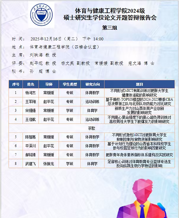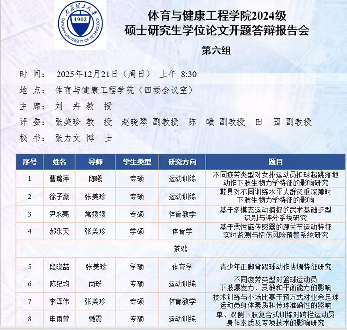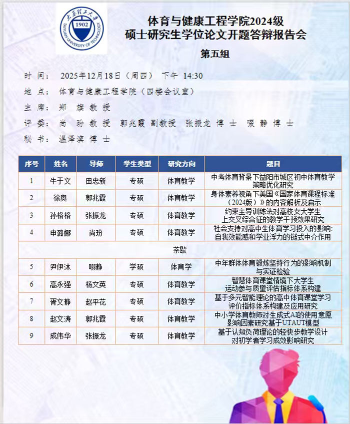 12月15日至30日,伟德BV1946进行了2024级硕士研究生学位论文开题答辩报告会。根据研究方向,报告会分为7组进行,分别邀请校外专家北京体育大学张瑛秋教授、北京体育大学刘卉教授、山西师范大学郑旗教授、山西大学石岩教授、山西大学刘映海教授和山西大学吴丽君教授担任答辩委员会主席,伟德BV1946硕士研究生导师担任答辩委员会成员。开题过程严格遵循学校研究生培养的相关规定与程序要求。