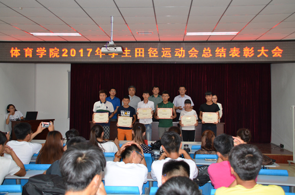 任晋军对大家在运动会上的辛勤付出提出表扬,对全体师生所体现出来的体育精神、团队精神和协作意识表示肯定与赞赏。并希望大家能积极响应习近平总书记重要指示精神,在四年的学习当中不仅要在体育上优秀,还要更好的学习体育理论知识,从而度过一个充实、健康的大学生活。史冬博宣读了2017年学生田径运动会优秀个人表彰决定,本次表彰了特殊贡献奖、优秀运动员、优秀志愿者、优秀工作者等43人。随后进行了颁奖仪式。张忠璞表示本次运动会充分体现了体院学子的“集体至上、众志成城”的团队精神、“挑战自我、勇攀高峰”的进取精神,“不畏强手、敢于争锋”的拼搏精神,“不计得失、无私奉献”的志愿精神,“尊重规则、公平竞赛”的体育精神。