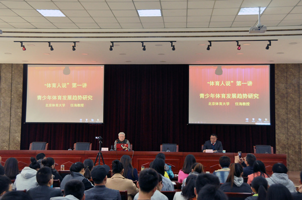 3月29日上午,我院主办的《体育人说》系列讲座第一讲《青少年体育发展趋势研究》讲座正式开讲。讲座由北京体育大学教授、博士生导师、国家体育科学研究所首席专家并兼任该所奥林匹克研究中心执行主任,中国体育科学学会理事会理事、体育社会科学学会副主任委员,国际奥委会奥林匹克研究中心研究理事会理事,国际比较体育学会执委任海教授主讲。