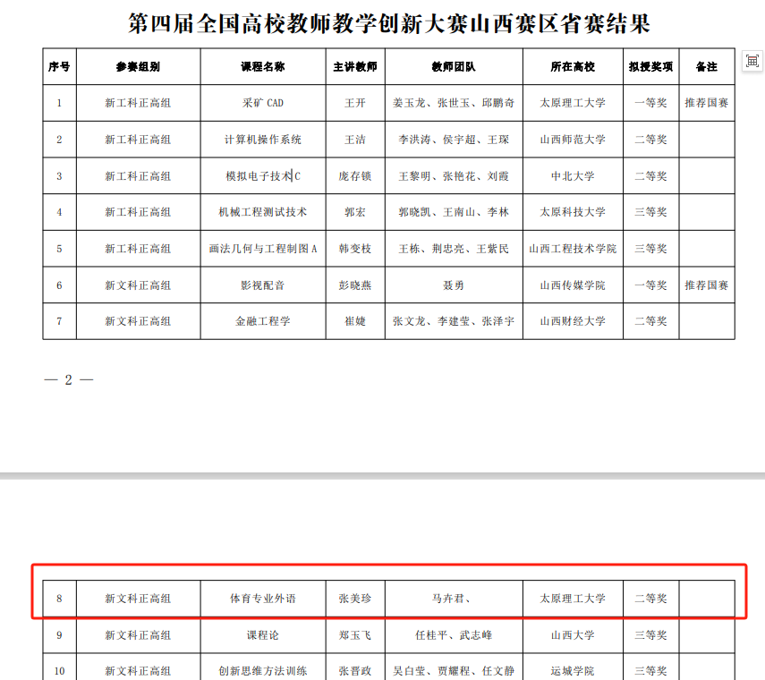 体育学院第四届全国高校 教师教学创新大赛山西赛区获奖名单