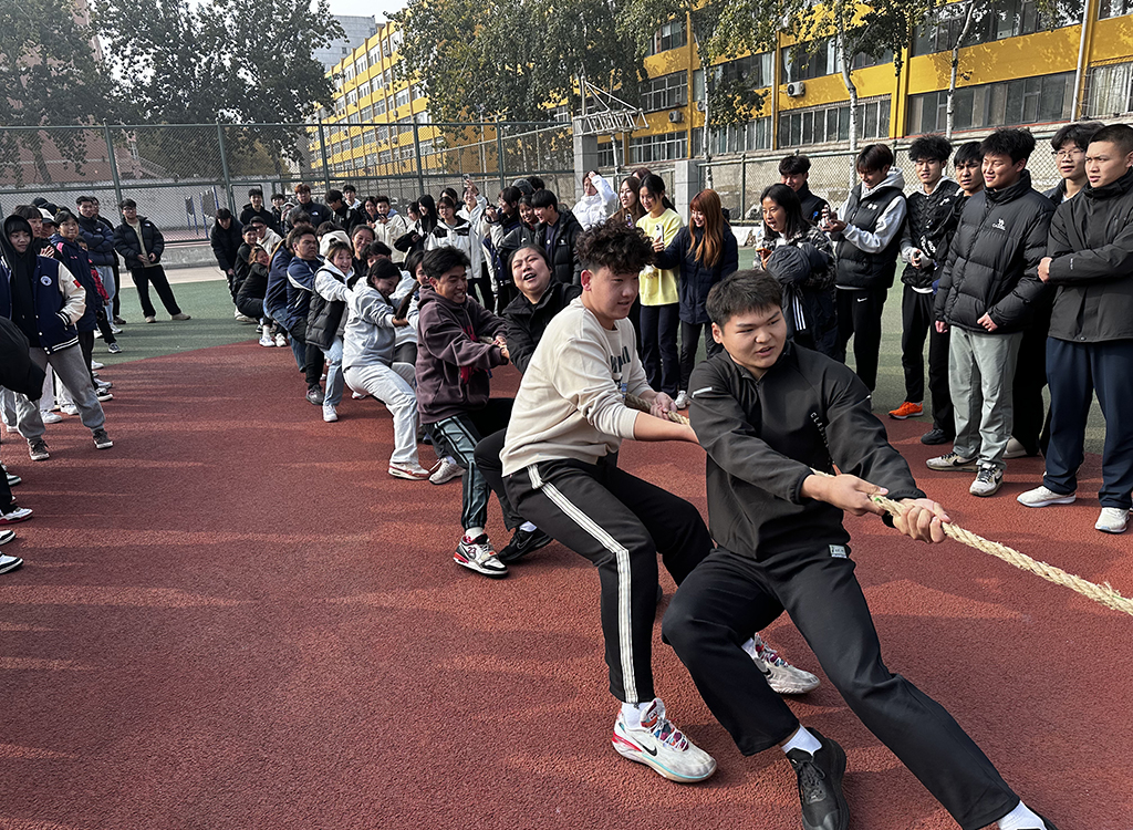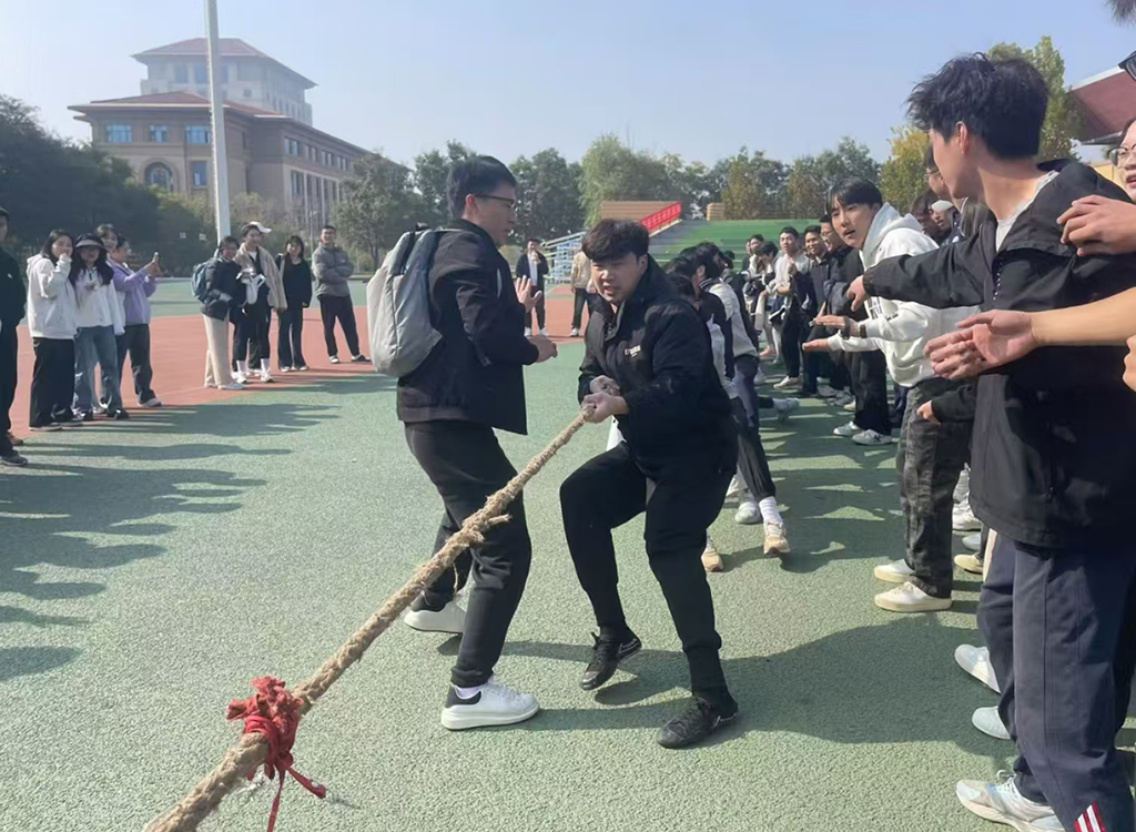 各个班级的代表人员组成16人的队伍(至少有1名女生),共计25支参赛队伍。随着一声哨响,拔河比赛正式拉开帷幕。参赛队员们个个斗志昂扬,紧握长绳,脚抵着脚,卯足了劲往后拉仿佛握住了整个世界的重量。在比赛过程中,各队队员齐心协力、奋勇拼搏,他们涨红了脸,咬紧牙关,不到最后一刻绝不放弃。场边的观众也被这热烈的气氛所感染,纷纷为自己支持的队伍呐喊助威,加油声、欢呼声此起彼伏,响彻整个赛场,斗志与激情燃尽了整个体育场。