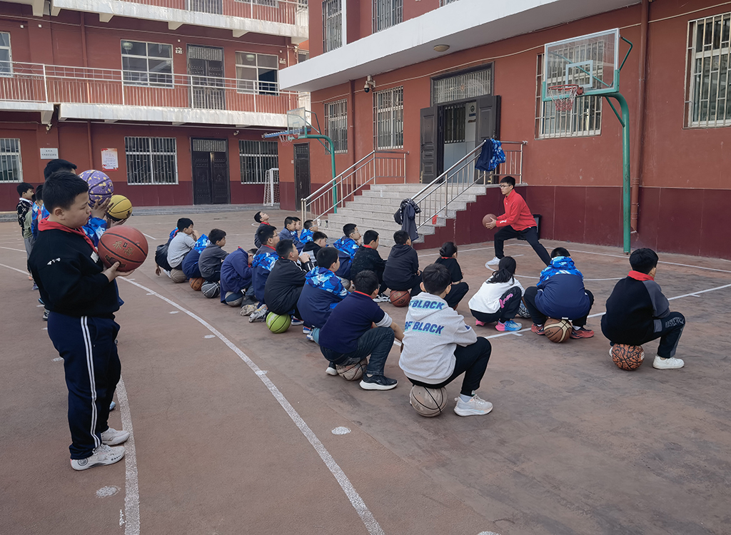 城关一小支教团队立足学校体育特色,创新组建篮球训练社团。基于青少年体能发展规律,开发了"五指贴标法"运球矫正体系:通过手掌标识可视化教学,将复杂的运球手型分解为直观动作模块。通过系统培训帮助本校教师掌握篮球教学技能,从基础动作分解、训练方法设计到课程组织进行全方位指导