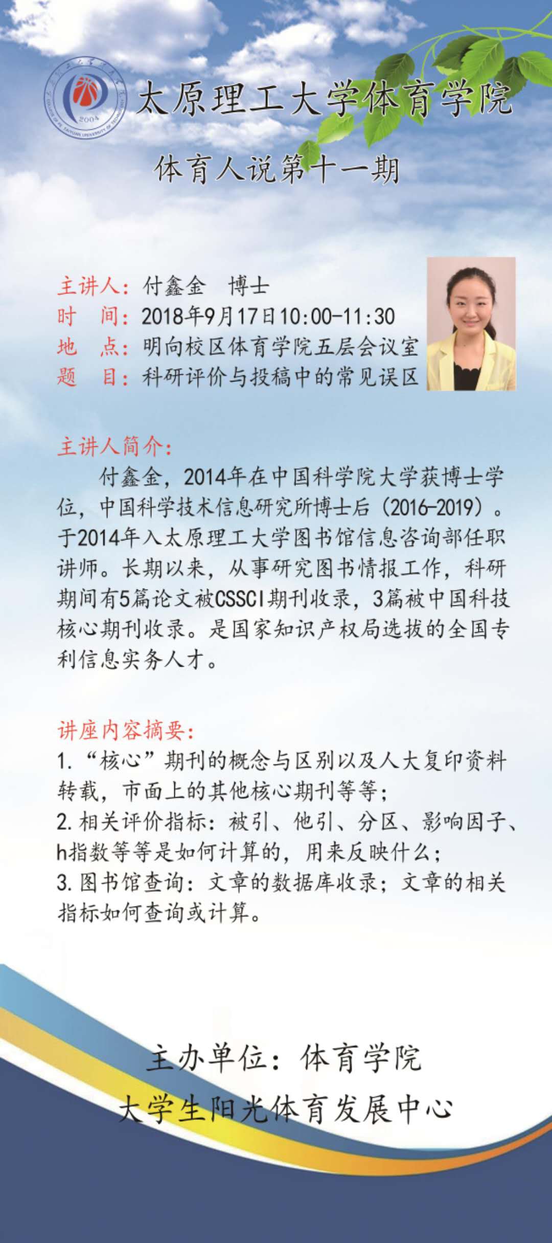 本学期体育学院《体育人说》系列讲座第十一讲《科研评价与投稿中的常见误区》于2018年9月17日(周一)上午10:00开讲,详情请见海报内容。希望各位老师准时参加!