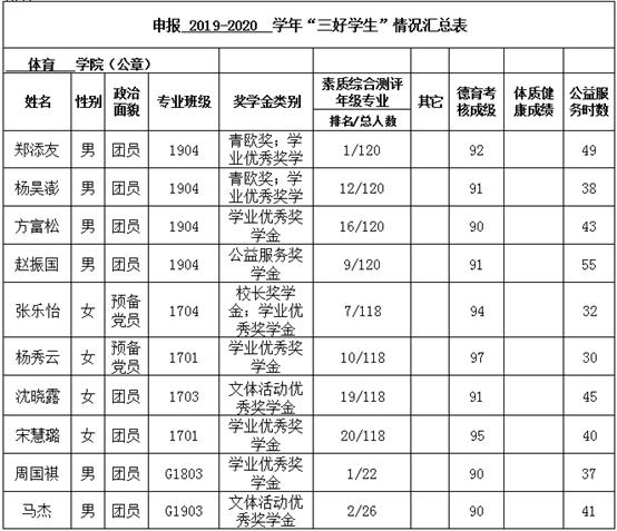 依据评审条件,按照《体育学院2019/2020学年三好学生、优秀学生干部、先进班集体评选工作细则》文件精神,我院于2020年10月21日召开了评审工作会议,对我院拟申报人员的申报材料,进行了认真审查。于2020年10月26日至10月30日公示,公示期间有异议者可申请进行复议。
