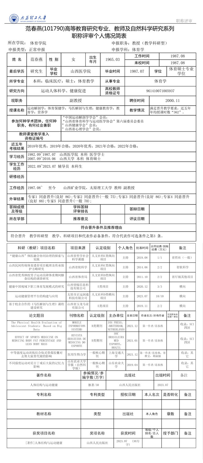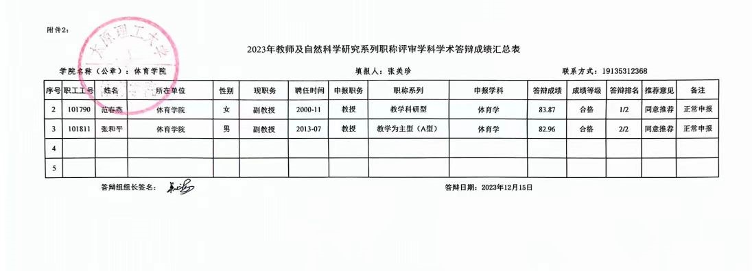 根据《山西省高级专业技术职务任职资格评审答辩规则》(晋人职字〔2006〕30号)及《bevitor伟德国际1946职称分类评聘实施总则》(2023年)(校人〔2023〕6号)规定,体育学科评议组于2023年12月15日召开2023年主系类高级职称学术答辩会,现将答辩通过名单公示如下: