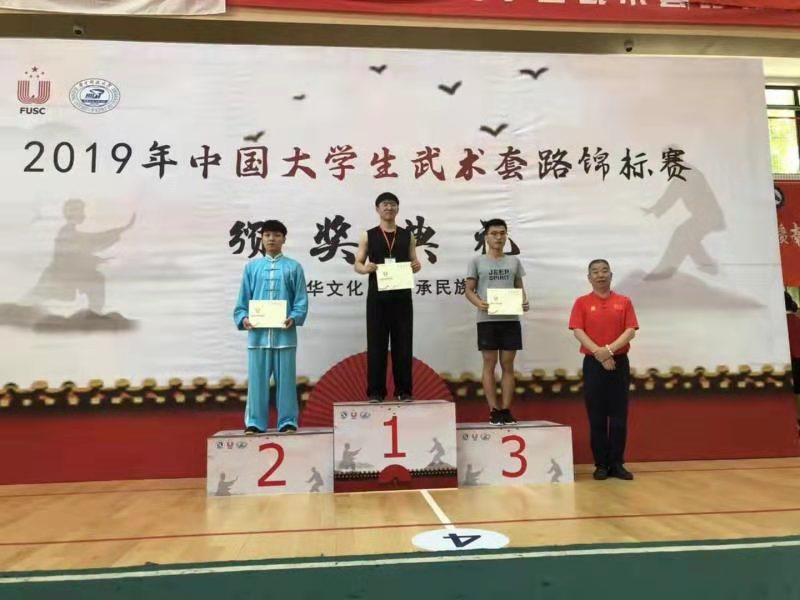 7月18日至24日,由中国大学生体育协会主办的2019年中国大学生武术套路锦标赛在华中科技大学隆重举行。我校武术代表队健儿不畏强手、顽强拼搏,取得优异成绩。在非体育专业组比赛中,陈润宇同学获得男子丁组陈氏太极拳第一名;陈明璇同学分获女子丁组吴式太极拳、其他太极器械第一名和第二名;马可同学分获男子丁组42式竞赛太极拳和地躺拳第一名;吉祥瑞同学获得女子丁组通臂拳第五名;于文玉同学获得女子丁组华拳第五名;在体育专业组比赛中,体育教育专业2016级林哲、路鹏同学分获男子丙组八极拳、通臂拳第一名和第五名的好成绩。