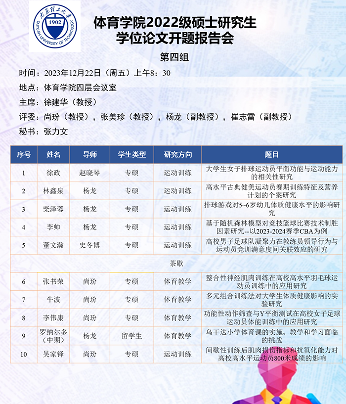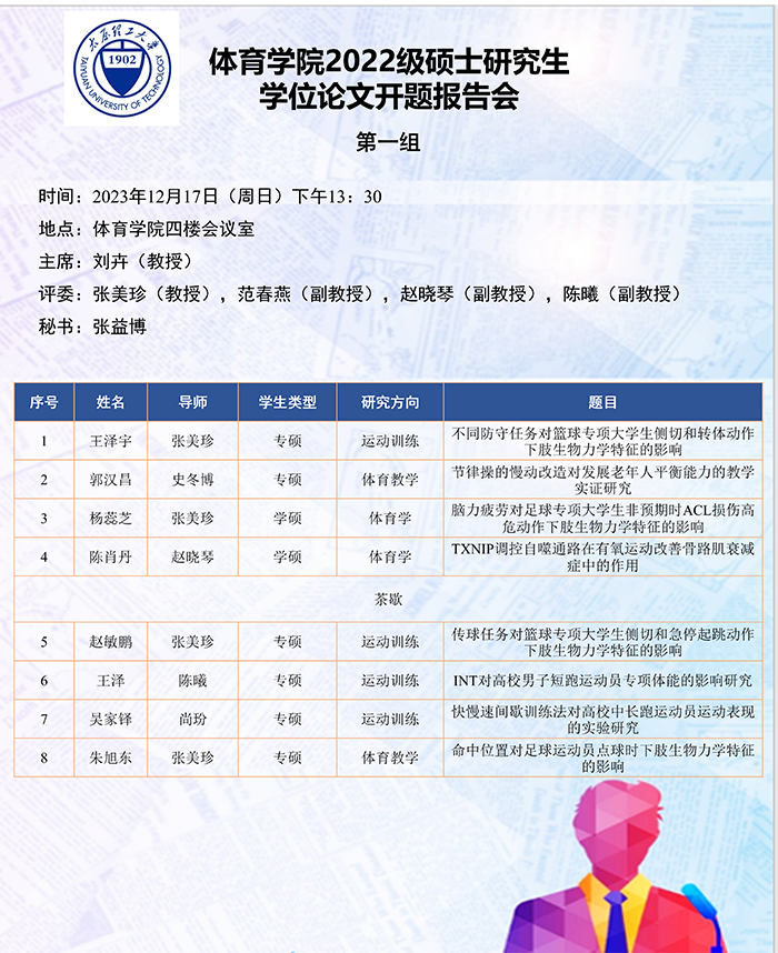 研究生学位论文开题报告是研究生开展学位论文工作的基础,是保证学位论文质量的重要前提,也是研究生培养工作的重要环节。为进一步把握论文质量,规范论文要求,体育学院于12月17日至22日进行了2022级硕士研究生论文开题工作。