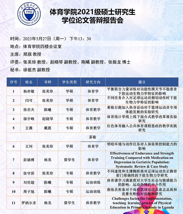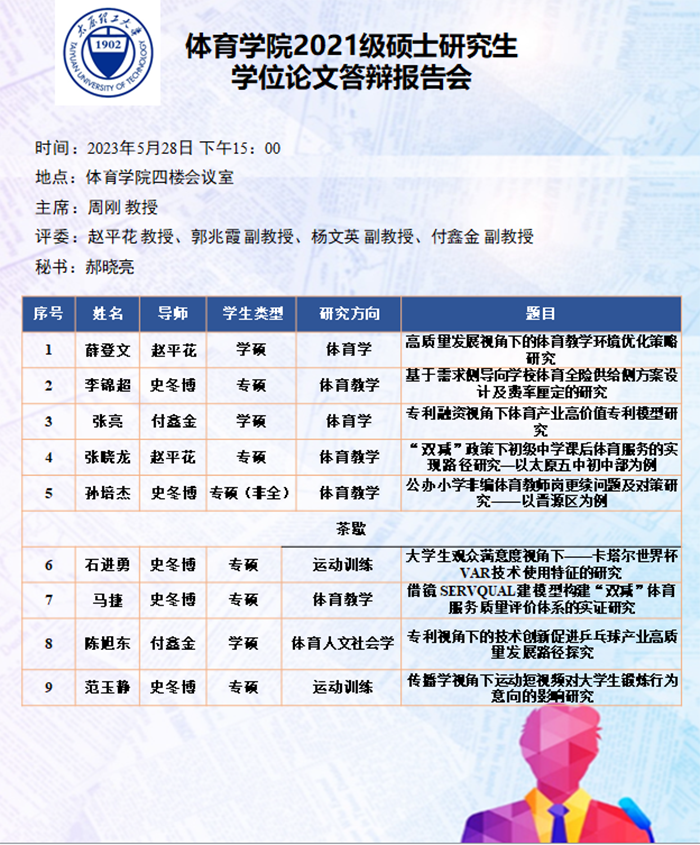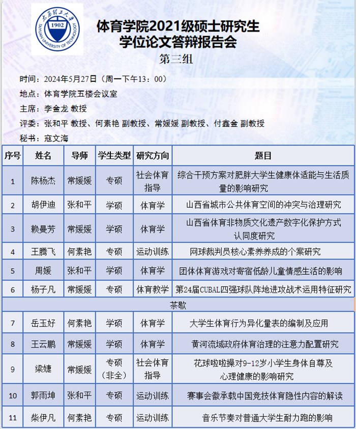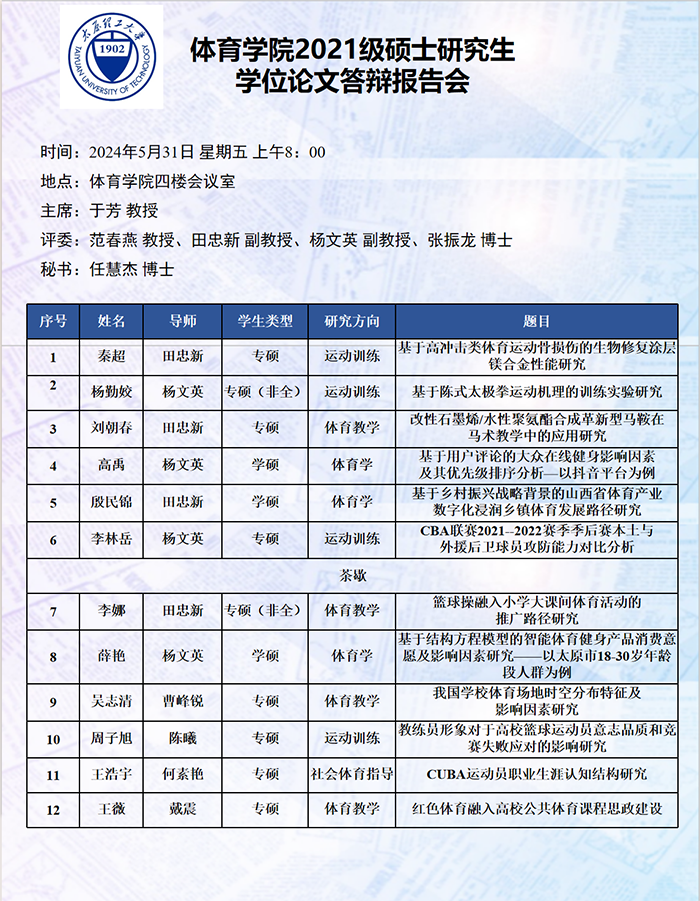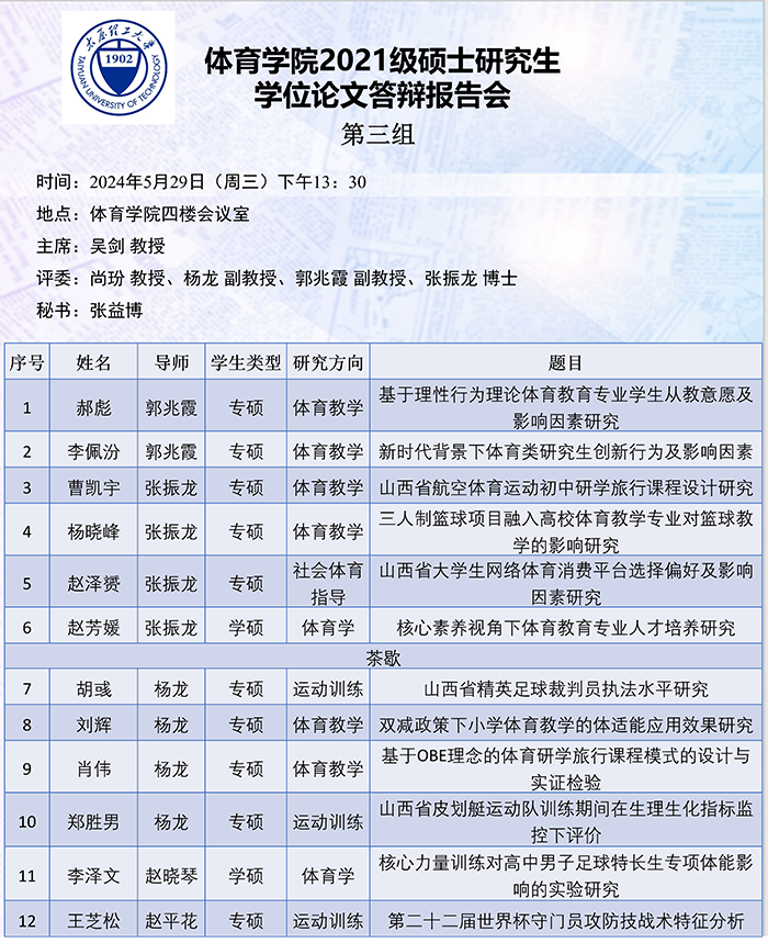 5月27日至31日,体育学院进行了2024届硕士研究生论文答辩报告会。根据研究方向,报告会分为5组进行,均邀请校外专家郑旗(教授,山西师范大学)、吴剑(教授,中北大学)、于芳(教授,中北大学)、李金龙(教授,山西大学)和周刚(教研员,太原市教研科研中心)担任答辩委员会主席,体育学院硕士研究生导师担任答辩委员会成员。