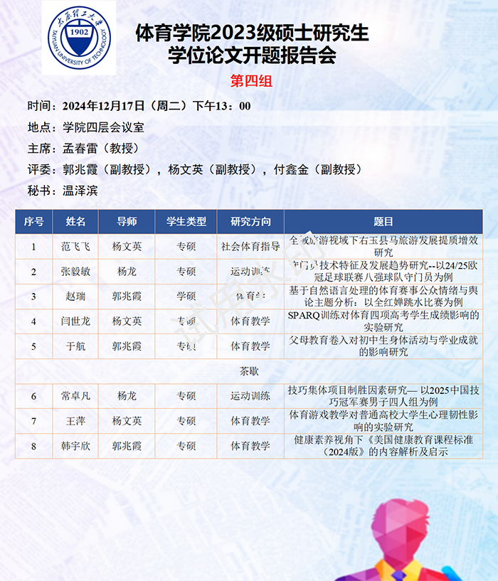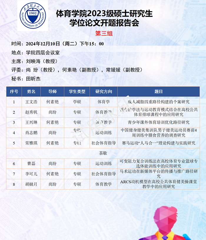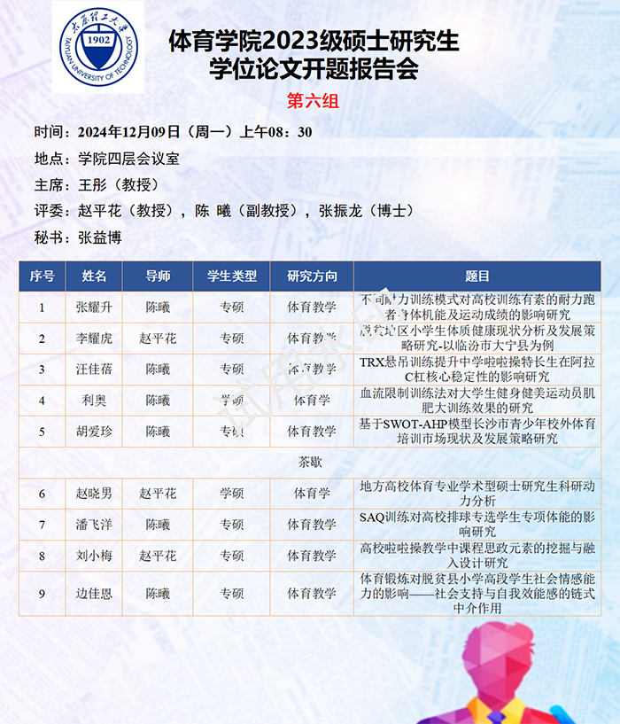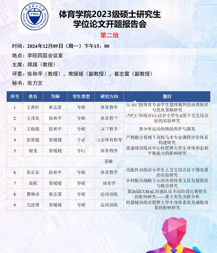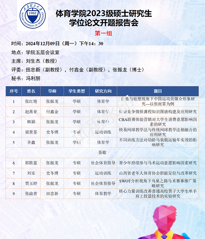 依据研究方向,报告会分为六组进行,由校外专家北京体育大学刘卉教授、山西大学体育学院刘映海教授、山西大学体育学院刘生杰教授、山西师范大学郑旗教授、山西师范大学王彤教授、山西师范大学孟春雷教授,担任答辩委员会主席,由体育学院硕士生导师担答辩任委员会成员,共同完成了此次开题答辩报告会。
