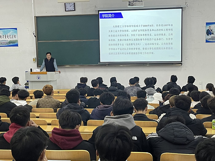 2023年11月19日下午,在明向校区,体育教育系主任张和平副教授以《加强内涵式发展助推“双一流”建设》为主题为体育教育(含赛马方向)新生开展专业介绍,并详细介绍了体育教育系师资队伍、研究方向和历年毕业学生职业发展。2020级本科生学长曲云强、高境辰与同学们进行了体育强国-新时代青年成长历程分享交流,从专业学习、学生工作、课余实践、未来发展四个方面分享了自己在大学期间的学习方法和经验,通过自己精彩的大学生活与同学们共同凝聚奋进力量。