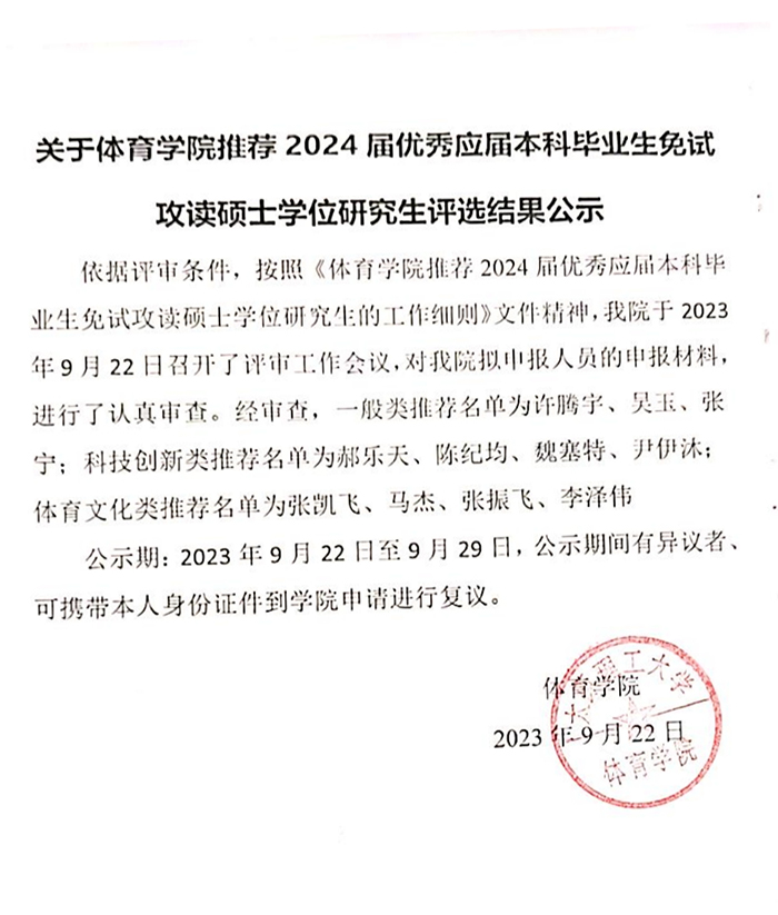体育学院推荐2024届优秀毕业本科生免试攻读硕士研究生评选结果公示