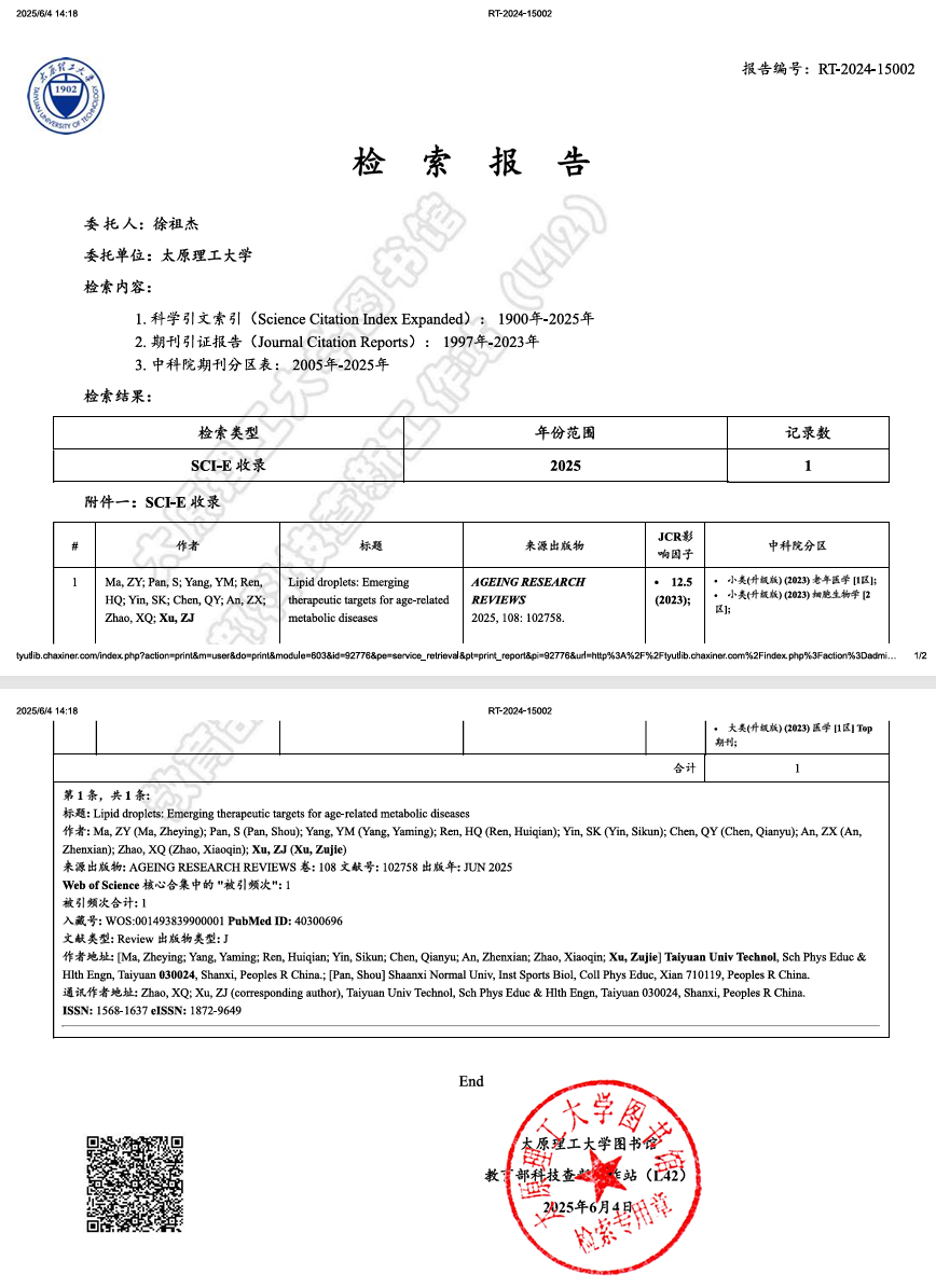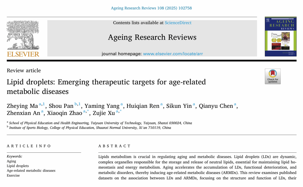我院教师徐祖杰副教授的研究成果《Lipid droplets: Emerging therapeutic targets for age-related metabolic diseases》在《Ageing Research Reviews》2025年第108卷在线发表。《Ageing Research Reviews》是一本专注于衰老研究领域的高影响力期刊,聚焦于老龄化研究的广泛领域,重点关注老龄化过程的细胞和分子机制以及与年龄相关的疾病。该期刊被SCIE(Science Citation Index Expanded)数据库收录,为JCR-Q1、中科院1区Top期刊,最新影响因子为12.5。该论文是我院硕士研究生马哲莹(第一作者)在导师赵晓琴副教授、徐祖杰副教授(通讯作者)指导下完成的研究成果,bevitor伟德国际1946体育与健康学院为第一署名单位。