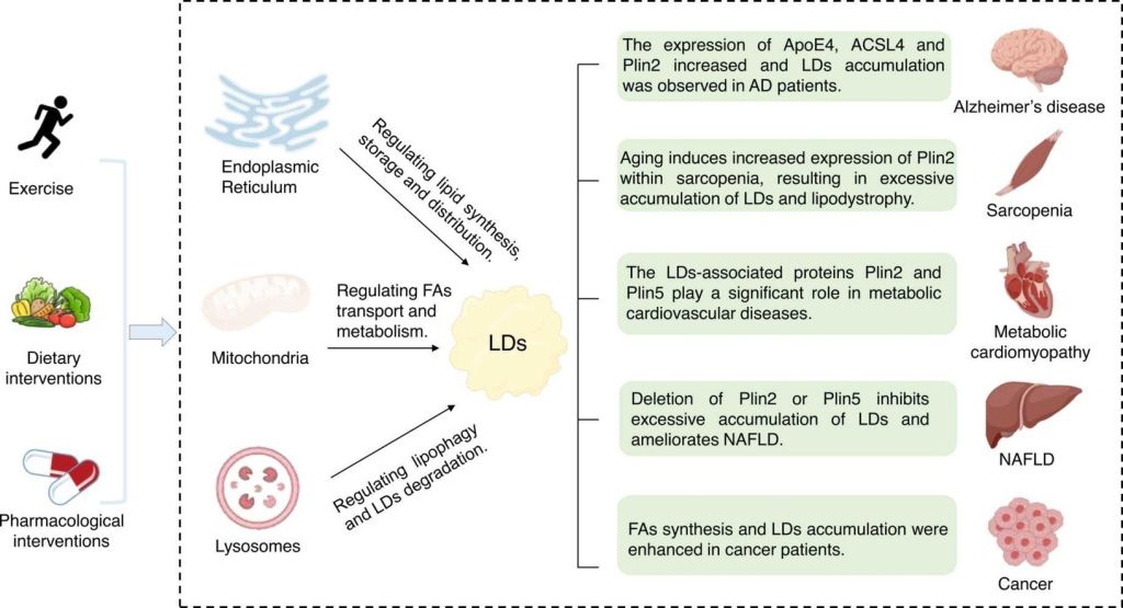 该论文系统阐述了脂滴的结构和功能,以及脂滴与内质网、线粒体和溶酶体等细胞器的相互作用。此外,该论文探讨了脂滴及其相关蛋白在阿尔茨海默症、肌肉减少症、代谢性心肌病、非酒精性脂肪肝和癌症等衰老相关代谢性疾病中的作用及机制。最后该论文总结了运动、饮食和药物干预等手段通过靶向脂滴改善衰老相关代谢性疾病的研究现状和未来展望。