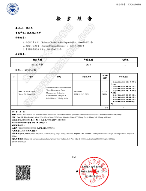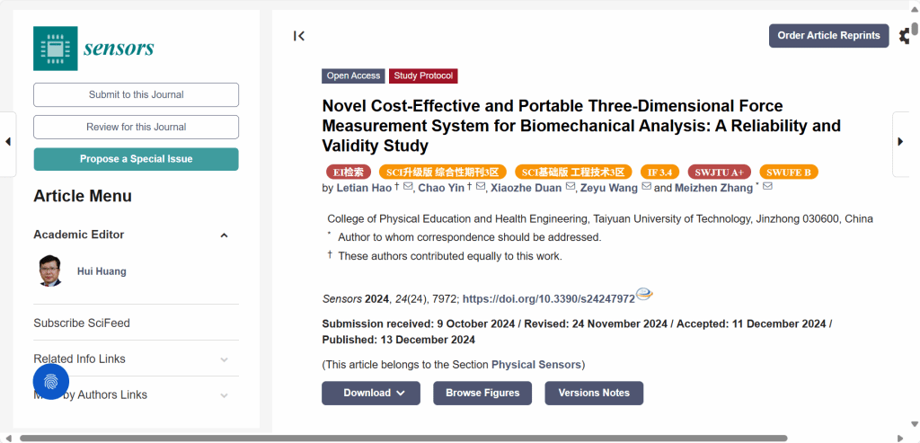 我院教师张美珍教授团队的研究成果《Novel Cost-Effective and Portable Three-Dimensional Force Measurement System for Biomechanical Analysis: A Reliability and Validity Study》在《sensors》发表。《sensors》是由瑞士开放获取出版社MDPI创办的国际性、同行评审的在线期刊,专注于传感器及其应用领域的研究。该期刊涵盖物理传感器人工智能与模式识别等多个交叉学科方向。主要发表传感器及其应用的科学和技术领域原创研究论文、综合评论等。该期刊被SCIE(Science Citation Index Expanded)收录,被评定为“JCR-Q2,中科院3区,影响因子3.4(2023年)”期刊。该论文是我院硕士研究生郝乐天、尹超(共同第一作者)在导师张美珍教授(通讯作者)指导下的研究成果,伟德BV1946为第一署名单位。