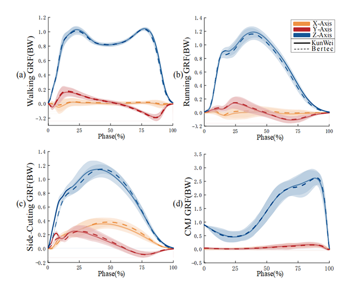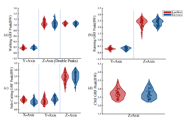 本研究旨在验证Kunwei三维测力台的可靠性与有效性。通过对15名男性大学生执行步行、跑步、纵跳和侧切四种动作,采用t检验、ICC和NRMSE评估Kunwei与Bertec设备的性能一致性。结果表明,Kunwei系统在峰值力测量上与Bertec系统无显著差异,ICC值超过0.98,RMSE低于0.165,显示出其高精确性和一致性。综上所述,Kunwei系统是一种经济高效的替代方案,适用于运动训练、康复及临床诊断等领域。