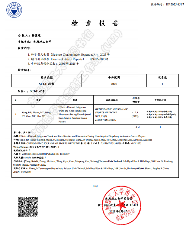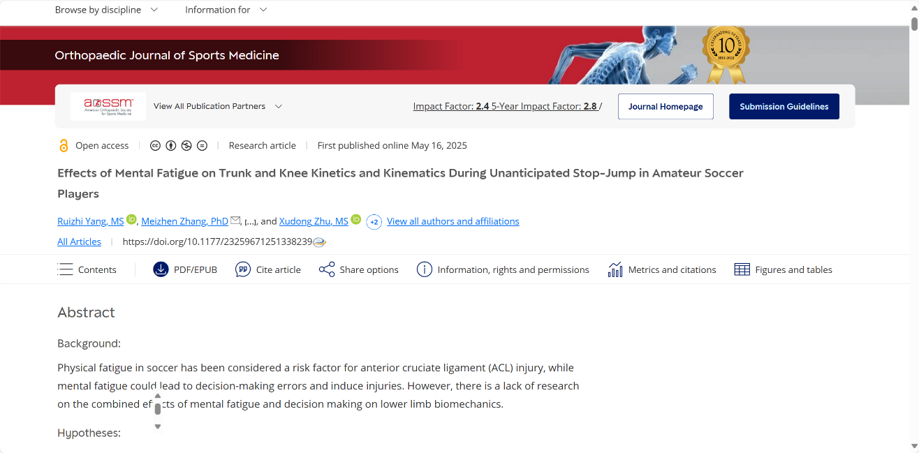 我院教师张美珍教授团队的研究成果《Effects of Mental Fatigue on Trunk and Knee Kinetics and Kinematics During Unanticipated Stop-Jump in Amateur Soccer Players》在《Orthopaedic Journal of Sports Medicine》在线发表。《Orthopaedic Journal of Sports Medicine》是由美国运动医学会(AOSSM)开发的一本全球性、同行评审的在线期刊。聚焦骨科运动医学、关节镜手术、膝关节和肩关节置换术以及运动相关损伤的统计与预防等研究方向。该期刊被SCIE(Science Citation Index Expanded)收录,被评定为“JCR-Q2,中科院3区,影响因子2.4(2023年)”期刊。该论文是我院硕士研究生杨蕊芝(第一作者)在导师张美珍教授(通讯作者)指导下完成的研究成果,伟德BV1946为第一署名单位。