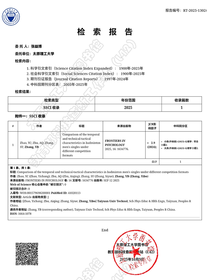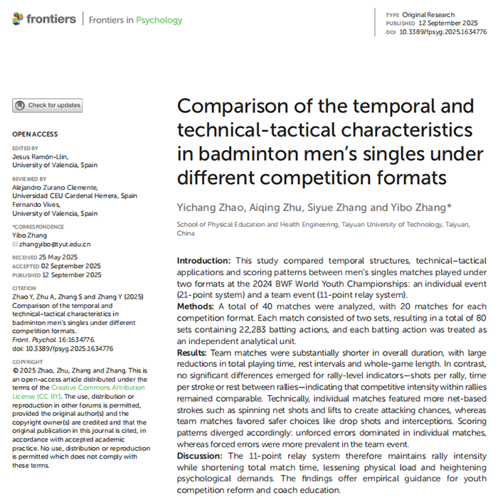 我院运动训练专业本科生赵一畅作为第一作者撰写的学术论文《Comparison of the temporal and technical-tactical characteristics in badminton men’s singles under different competition formats》在期刊《Frontiers in Psychology》在线发表。该期刊致力于发表心理学与行为科学领域的研究成果,涵盖认知心理学、持拍类运动项目比赛表现、运动表现心理以及神经科学等主要方向,尤其关注竞技体育情境下运动员的决策机制、情绪调节与行为控制等相关议题。该期刊被SSCI(Social Sciences Citation Index)收录,被评定为“JCR-Q1,中科院3区,影响因子2.9(2023年)”期刊。该论文是我院本科生赵一畅(第一作者)在老师张益博博士(通讯作者)指导下完成的研究成果,伟德BV1946为第一署名单位。