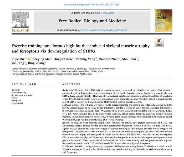 我院徐祖杰副教授的研究论文《Exercise training ameliorates high-fat diet-induced skeletal muscle atrophy and ferroptosis via downregulation of STING》在《Free Radical Biology and Medicine》期刊在线发表。《Free Radical Biology and Medicine》是自由基生物学与医学领域的国际权威期刊,专注于氧化还原生物学、自由基在生理与病理过程中的作用及其与疾病的关系,该期刊被SCIE(Science Citation Index Expanded)数据库收录,为JCR-Q1,中科院2区Top期刊,影响因子为8.2。我院教师徐祖杰副教授为该论文的第一作者和独立通讯作者,伟德BV1946为第一署名单位。