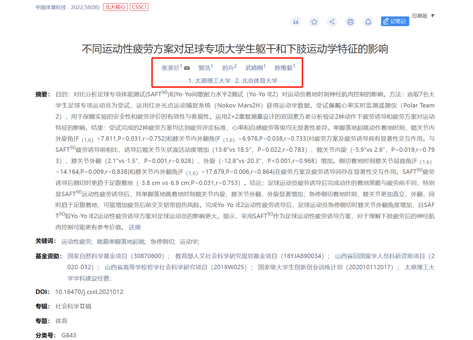 我院教师张美珍教授的研究成果《不同运动性疲劳方案对足球专项大学生躯干和下肢运动学特征的影响》在《中国体育科技》(2022年第8期)发表。中国体育科技由国家体育总局主管,国家体育总局体育科学研究所主办,多年来一直是中文体育类核心期刊、中国人文社会科学核心期刊、CSSCI来源期刊,中国社科院期刊评价报告评为核心期刊。该论文是张美珍教授(第一作者)与北京体育大学刘卉教授、bevitor伟德国际1946陈维毅教授团队的合作成果,bevitor伟德国际1946体育学院为第一署名单位。