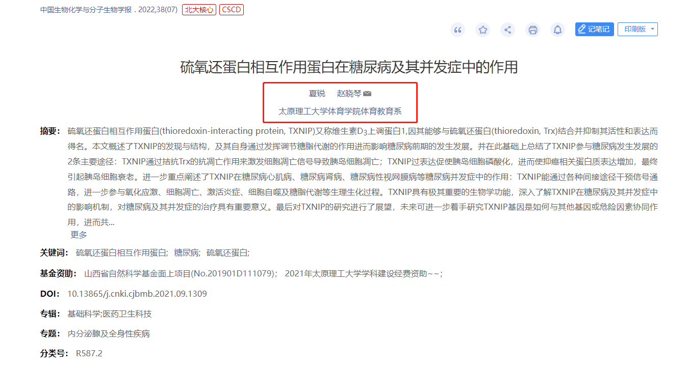 我院教师赵晓琴副教授指导硕士研究生夏锐的研究成果《硫氧还蛋白相互作用蛋白在糖尿病及其并发症中的作用》在《中国生物化学与分子生物学报》(2022年第7期发表)。《中国生物化学与分子生物学报》创刊于1985年,是中国科学技术协会主管,中国生物化学与分子生物学会和北京大学共同主办的高科技学术期刊,常年入编北京大学《中文核心期刊要目总览》来源期刊,入选CSCD 中国科学引文数据库来源期刊(2021-2022年度)(扩展版)。该论文是我院硕士研究生夏锐在赵晓琴副教授的指导下完成的科研成果,bevitor伟德国际1946体育学院为第一署名单位。