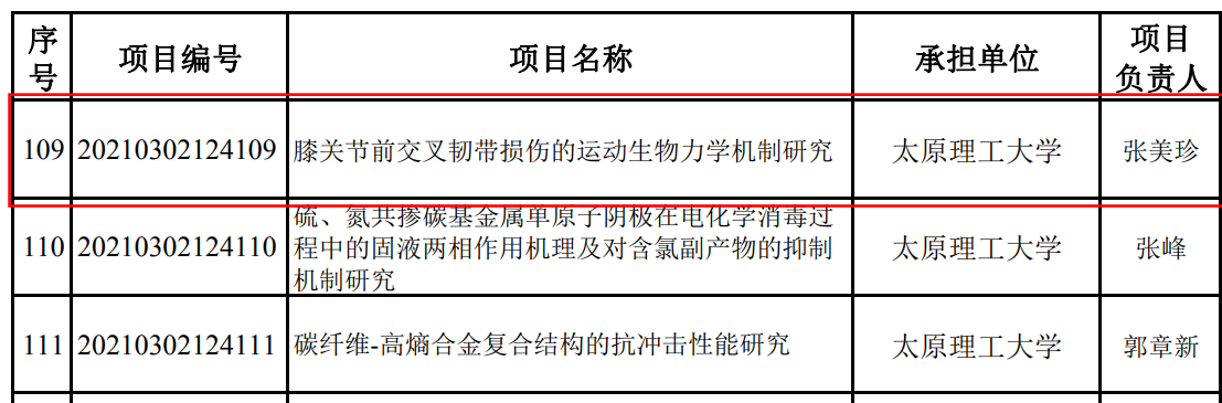2022年1月21日,山西省科学技术厅发布了“2021年度第二批山西省基础研究计划(自由探索类)拟资助项目公示”,立项公示显示,本次共立项938项。我院张美珍教授申报的项目“膝关节前交叉韧带损伤的运动生物力学机制研究”榜上有名,获批自然科学研究面上项目,该项目科研进账经费8万元。