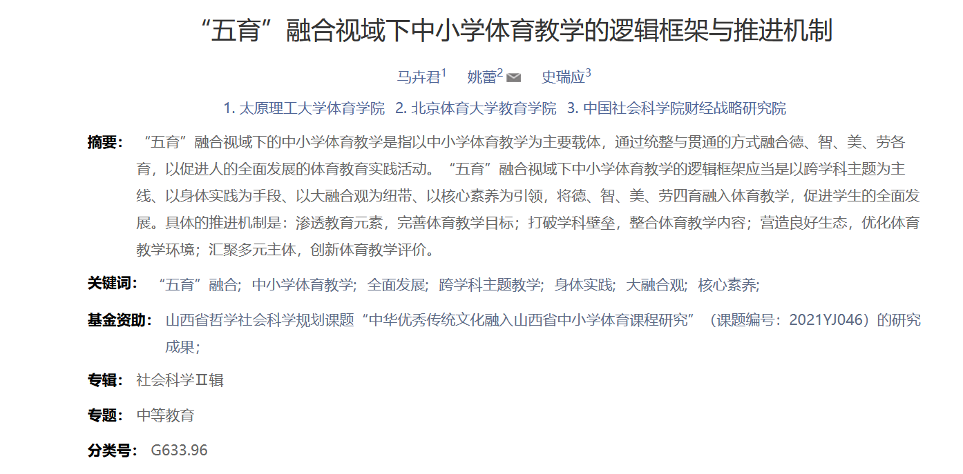 我院教师马卉君博士的研究成果《“五育”融合视域下中小学体育教学的逻辑框架与推进机制》在《教育理论与实践》(2022年11月)发表。《教育理论与实践》是山西教育科学研究院、山西省教育学会主办的综合性教育学术期刊,入编《中文核心期刊要目总览》(2020年版),被评定为“中国人文社会科学期刊AMI综合评价”A刊核心期刊。该论文是马卉君博士(第一作者)、北京体育大学姚蕾教授(通讯作者)、中国社会科学院史瑞应助理研究员的合作成果,bevitor伟德国际1946体育学院为第一署名单位。
