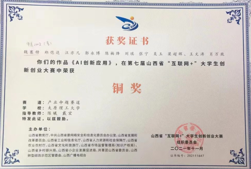 在我院教师陈曦副教授的指导下,我院学子魏塞特(项目负责人)同学的研究项目《AI创新应用》在第七届山西省“互联网+”大学生创新创业大赛中荣获铜奖(2021年11月)。2021年7月25日至27日,由省教育厅等13家单位共同主办,我校承办的“建行杯”第七届山西省“互联网+”大学生创新创业大赛总决赛在我校明向校区举行。本届大赛以“我敢闯、我会创”为主题,旨在全面贯彻落实习近平总书记给中国“互联网+”大学生创新创业大赛“青年红色筑梦之旅”大学生重要回信精神,深入推进大众创业万众创新,推动高等教育高质量发展,加快培养创新创业人才;以赛促教,探索人才培养新途径;以赛促学,培养创新创业生力军;以赛促创,搭建产教融合新平台。该项目是我院学子在体育学院陈曦副教授(第一指导教师)与经济管理学院戴宏副教授(第二指导老师)指导下共同完成的,bevitor伟德国际1946为第一署名单位。