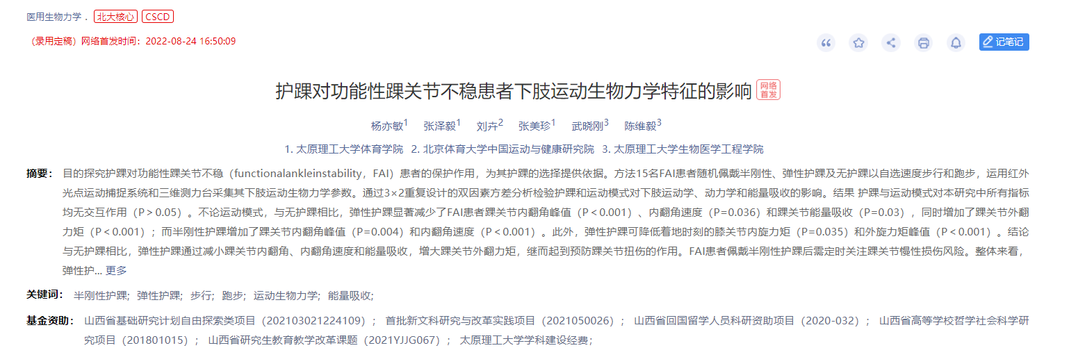 我院张美珍教授指导的硕士研究生杨亦敏的研究成果《护踝对功能性踝关节不稳患者下肢运动生物力学特征的影响》在《医用生物力学》上网络首发。《医用生物力学》杂志由上海交通大学主办,中华人民共和国教育部主管,上海交通大学医学院附属第九人民医院承办,是国内唯一一本公开发行,以积极反映生物力学基础研究与应用研究成果,目前是双核心期刊(北京大学中文核心期刊以及科技部科技核心期刊),并被全球最大的文献摘要与科研信息引用数据库Scopus收录。该论文是我院硕士研究生杨亦敏(第一作者)在导师张美珍教授(通讯作者)的指导下,与bevitor伟德国际1946陈维毅教授团队、北京体育大学刘卉教授团队的合作成果,bevitor伟德国际1946体育学院为第一署名单位。
