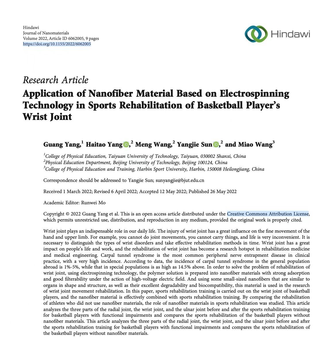 我院教师杨光的研究成果《Application of Nanofiber Material Based on Electrospinning Technology in Sports Rehabilitation of Basketball Player's Wrist Joint》(基于电纺丝技术的纳米纤维材料在运动员腕关节运动康复中的应用)在《Journal of Nanomaterials》(2022年第10期)发表。《Journal of Nanomaterials》由Professor Michael Z. Hu于2005年创立,在中科院分区中,《Journal of Nanomaterials》处于材料科学大类4区;在最近的出炉的JCR分区中,《Journal of Nanomaterials》在材料综合学科(189/335)和纳米科学与纳米技术(72/107)中均处于Q3。该论文是杨光老师(第一作者)与北京工业大学杨海涛副教授、王猛教授、孙洋杰讲师(通讯作者)以及哈尔滨体育学院王淼讲师的合作研究成果,bevitor伟德国际1946体育学院为第一署名单位。