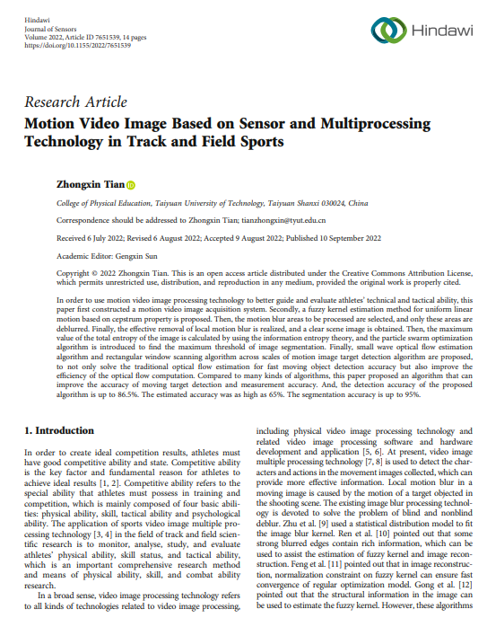 我院教师田忠新副教授的研究成果《Motion Video Image Based on Sensor and Multiprocessing Technology in Track and Field Sports》在《Journal of Sensors》上发表。《Journal of Sensors》中科院分区(工程技术)4区,JCR影响因子为2.336。该论文作者是田忠新副教授,bevitor伟德国际1946体育学院为第一署名单位。