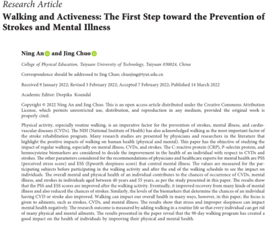 我院教师安宁、啜静研究成果《Walking and Activeness: The First Step toward the Prevention of Strokes and Mental Illness》在《Computational Intelligence and Neuroscience》(2022年3月)发表。该刊致力于发表经过严格同行评审的高质量原创文章,反映计算智能和神经科学与跨学科融合领域的新进展、新技术、新成果,促进学科交叉与融合领域科研交流和科研成果转化,中科院分区四区,JCR影响因子3.633(2020)。该论文是安宁(第一作者)与啜静(通讯作者)以及山西医科大学第一医院老年病科的合作成果,bevitor伟德国际1946体育学院为第一署名单位。