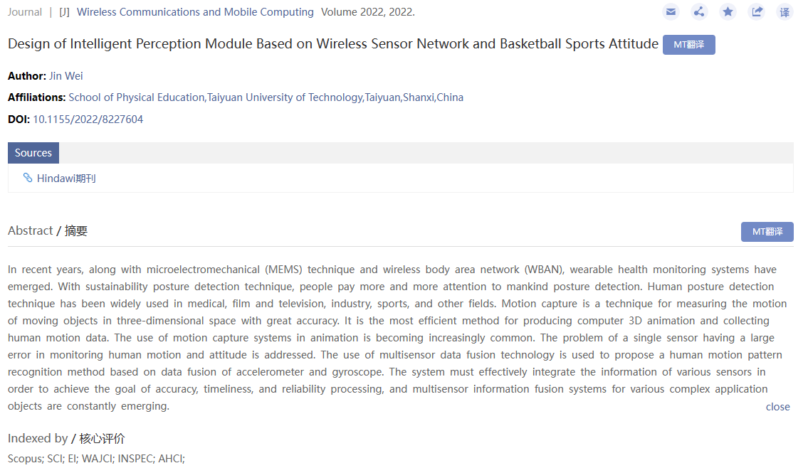 我院晋慰老师的研究成果《Optimal Modeling and Simulation of the Relationship between Athletes’ High-Intensity Training and Sports Injuries》在《Wireless Communications and Mobile Computing》上发表。《Wireless Communications and Mobile Computing》杂志为SCI四区期刊,期刊在SCI计算机科学及信息系统、电信学及电子与电气三类学科中具有较高的学术水平。该论文作者是晋慰老师,bevitor伟德国际1946体育学院为第一署名单位。