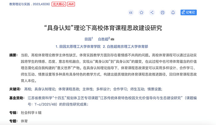 我院教师田园讲师的研究成果《“具身认知”理论下高校体育课程思政建设研究》在《教育理论与实践》(2023年第6期)发表。《教育理论与实践》是由山西省教育厅主管,山西教育科学研究院、山西省教育学会主办的综合性教育类学术期刊,该杂志是北京大学《中文核心期刊要目总览》来源期刊(2017年版),被中国知网、万方数据知识服务平台等数据库收录,被评为Cai-cd规范获奖期刊。该论文是我院田园老师(第一作者)与南京理工大学体育部白胜超老师的合作完成的科研成果,bevitor伟德国际1946体育学院为第一署名单位。