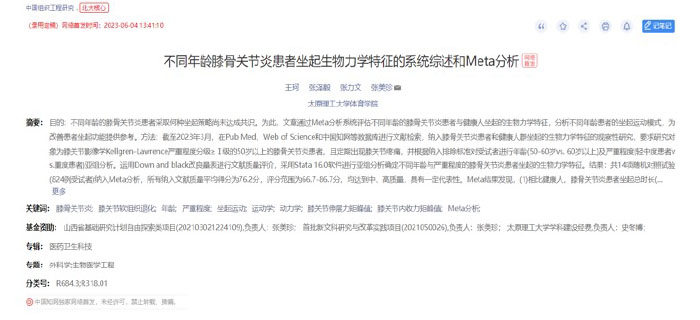 该论文通过Meta分析系统评估不同年龄的膝骨关节炎患者与健康人坐起的生物力学特征,分析不同年龄患者的坐起运动模式,为改善患者坐起功能提供参考。