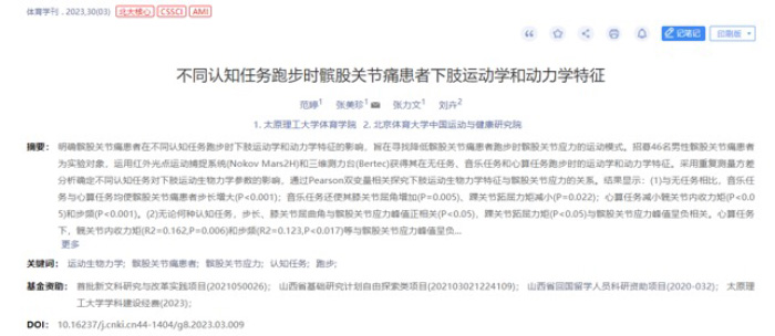 我院硕士研究生范婷的研究成果《不同认知任务跑步时髌股关节痛患者下肢运动学和动力学特征》在《体育学刊》(2023年第3期)发表。《体育学刊》是中华人民共和国教育部主管,华南理工大学和华南师范大学联合主办的体育学术刊物,2000年入选全国中文体育核心期刊,2002年被评为全国高校人文社科优秀学报,2006年获首届中国高校优秀科技期刊。《体育学刊》是中文社会科学引文索引(CSSCI)、北京大学《中文核心期刊要目总览》来源期刊、JST 日本科学技术振兴机构数据库(2022)等国内外多个知名检索期刊和数据库的刊源,是国内同类刊物中权威杂志。该论文是我院硕士研究生范婷(第一作者)在导师张美珍教授(通讯作者)的指导下,与北京体育大学刘卉教授团队的合作成果,bevitor伟德国际1946体育学院为第一署名单位。