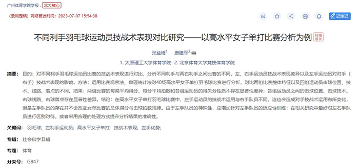 我院教师张益博博士的研究成果《不同利手羽毛球运动员技战术表现对比研究——以高水平女子单打比赛分析为例》在《广州体育学院学报》发表。《广州体育学院学报》是北京大学中文核心期刊,被加拿大、日本等国家的文献数据库收录。主要栏目有粤港澳大湾区专栏、体育社会科学、体育文化视角、竞技体育纵横、休闲体育论坛、体育探索求真、体育经济研究、体育教学探讨等。该论文是张益博博士(第一作者)与北京体育大学唐建军教授(通讯作者)的合作成果,bevitor伟德国际1946体育学院为第一署名单位。