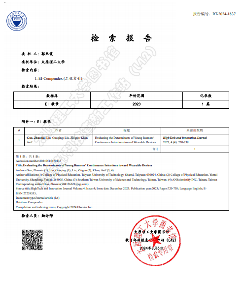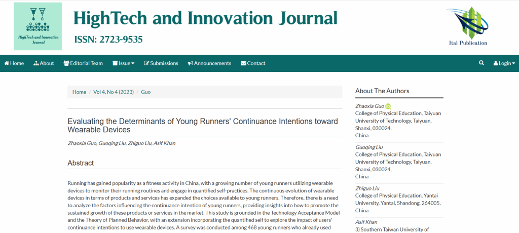 我院教师郭兆霞副教授的研究成果《Evaluating the Determinants of Young Runners' Continuance Intentions toward Wearable Devices》在《HighTech and Innovation Journal》在线发表。《HighTech and Innovation Journal》是一本同行评审的开放获取期刊,致力于发表集成工程和技术领域的研究论文,该期刊为EI期刊。该论文是郭兆霞(第一作者、通讯作者)团队的合作成果,bevitor伟德国际1946体育学院为第一署名单位。