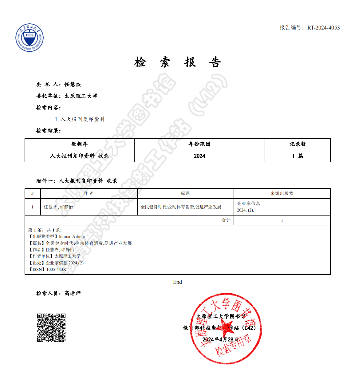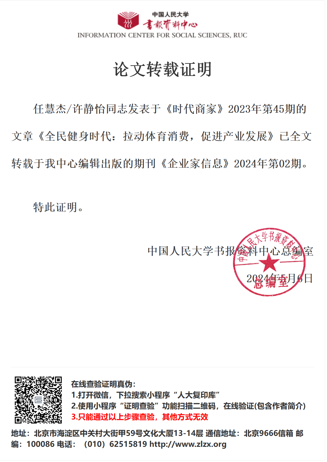 任慧杰博士团队于2023年在《时代商家》发表的论文《全民健身时代:拉动体育消费,促进产业发展》被中国人民大学复印报刊资料《企业家信息》2024年第2期全文转载,bevitor伟德国际1946体育学院为第一署名单位。