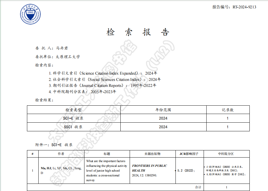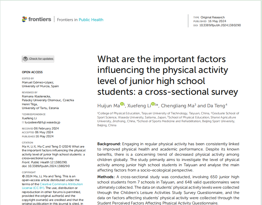 我院教师马卉君的研究成果《What are the important factors influencing the physical activity level of junior high school students: a cross-sectional survey》在《Frontiers in Public Health》发表。《Frontiers in Public Health》涵盖公共卫生方向的不同研究领域,旨在向全球研究人员、学者、临床医生、政策制定者和公众传播和交流科学知识和有影响力的发现的最前沿。该期刊同时被SCIE(Science Citation Index Expanded)和SSCI(Social Science Citation Index)双数据库收录,被评定为“JCR-Q2,中科院3区”期刊。该论文是马卉君博士(第一作者)、日本早稻田大学李雪峰博士(通讯作者)、山西农业大学马成亮教授、北京体育大学滕达的合作成果,bevitor伟德国际1946体育学院为第一署名单位。