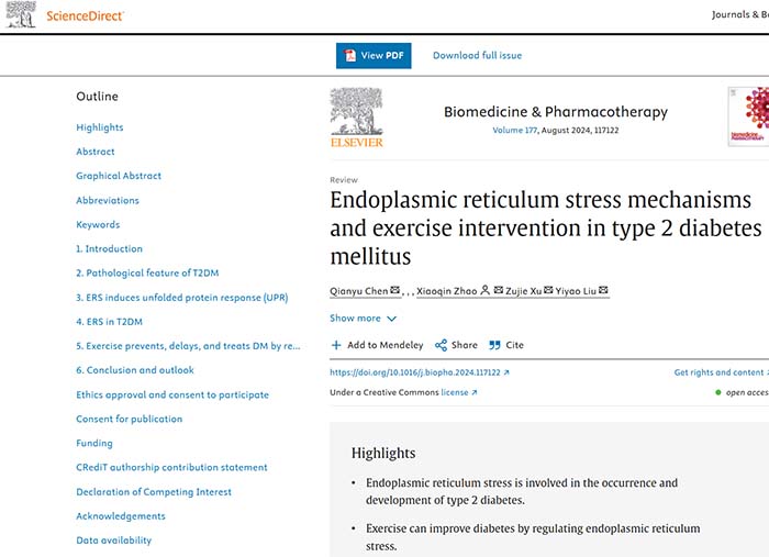我院教师赵晓琴副教授团队的研究成果《Endoplasmic reticulum stress mechanisms and exercise intervention in type 2 diabetes mellitus》在《Biomedicine & pharmacotherapy》在线发表。《Biomedicine & pharmacotherapy》主要发表生物医学领域原创研究论文、简短通讯和最新评论,强调特定主题的研究,例如分子机制、正常和病理细胞中的基因调控以及对致癌剂的敏感性。该期刊被SCIE(Science Citation Index Expanded)收录,被评定为“JCR-Q1,中科院2区top,影响因子6.9(2023年)”期刊。该论文是我院硕士研究生陈芊聿(第一作者)在导师赵晓琴副教授(通讯作者)指导下完成的研究成果,bevitor伟德国际1946体育学院为第一署名单位。