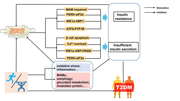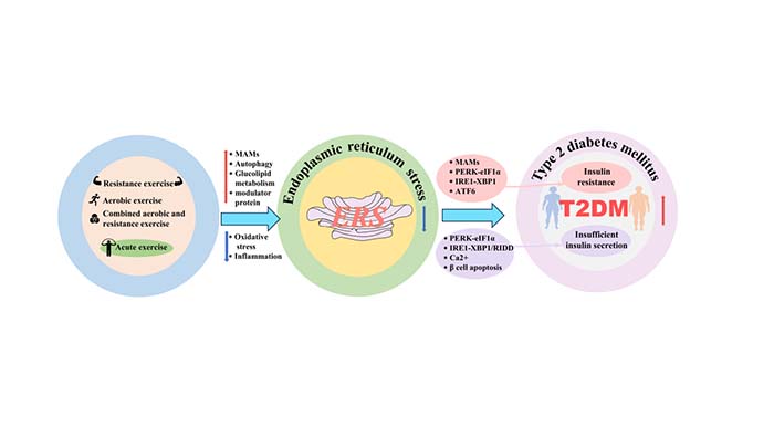该论文通过分析内质网应激(ERS)、2型糖尿病(T2DM)病理和运动干预之间的关系,对ERS诱导糖尿病的信号通路、运动调节糖尿病的机制以及不同类型运动改善糖尿病的ERS机制进行综述,最终得出结论,即运动可以通过调节ERS增加胰岛素敏感性、抑制胰岛素抵抗、促进胰岛素分泌,最终缓解T2DM。